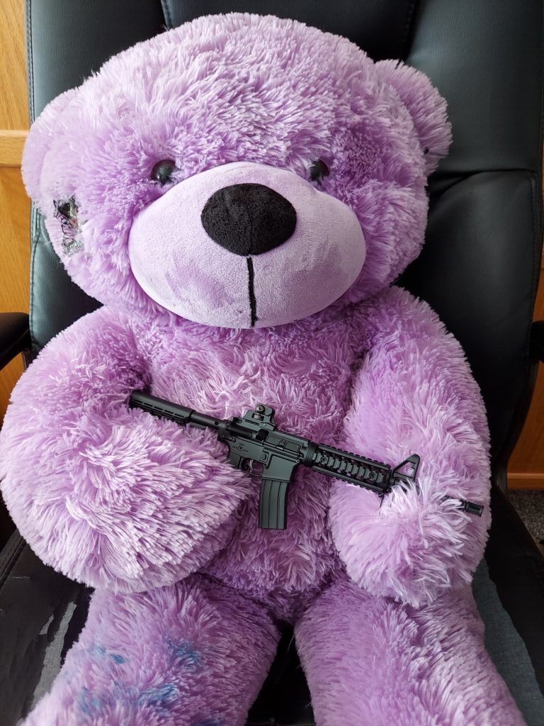 The Goat Gun AR-15 is the bomb. No, it isn’t a bomb, but rather in the idiomatic term that it is exceptional! It looks incredible (see for yourself) There is a very small amount of assembly (no tools) but is solid! I no longer have to worry about someone hugging the bear and hearing the telltale “snap” of the plastic breaking again.